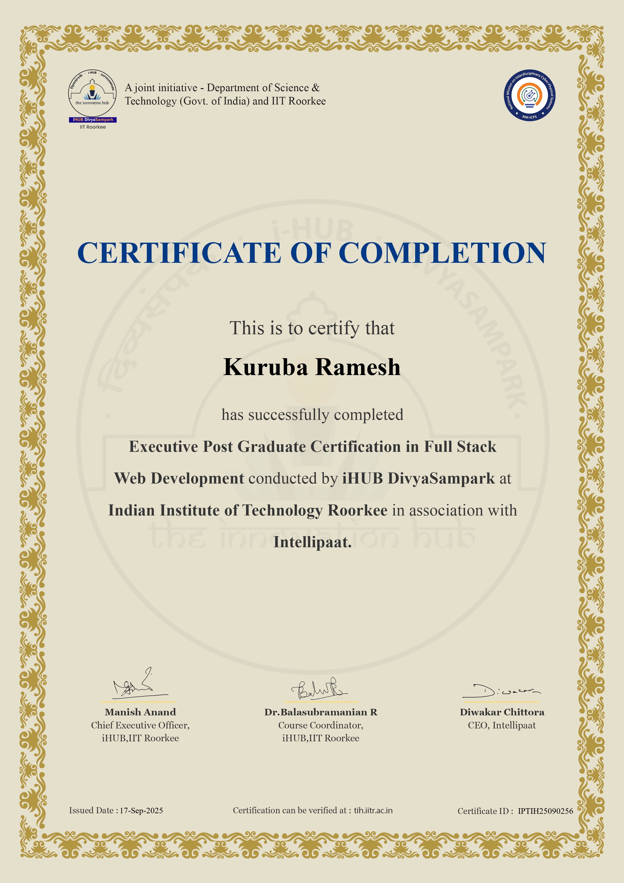 Hello everyone! My name is K. Ramesh, and I am an enthusiastic MERN stack developer and B.Tech graduate in Electrical & Electronics Engineering, with a strong interest in building web applications and learning modern technologies. I have also completed a Post-Executive Graduate Certificate in Full Stack Web Development from IIT Roorkee (iHub) — view certificate,which helped me strengthen my skills in web development. I enjoy creating responsive and user-friendly web applications using React, Next.js, Node.js, Express, MongoDB, and Tailwind CSS. I also dedicate my free time to learning and practicing Photoshop, Premiere Pro, and After Effects to improve my creative and multimedia skills. I am eager to take on projects that challenge me to learn and grow. My goal is to deliver practical and well-crafted digital solutions, while continuously improving my skills and gaining professional experience.